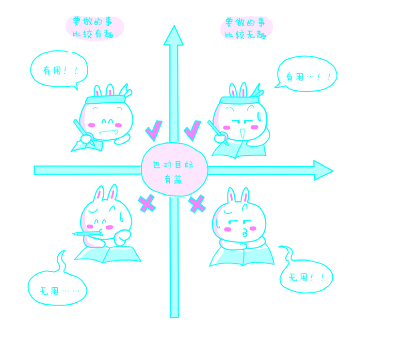 如果我们能甩甩头,强迫自己理智一些,就会知道:无用的事情,哪怕非常有趣都不应该去做;而有用的事情,哪怕非常无趣,都应该去做。请你认真面对自己想想看:过去一直是这样用理智指导自己行为的吗?(可对照下图检查一下,用阴影标出有用的事情。)