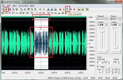 另外,如果熟悉计算机操作的话(其实也必须熟悉才对),还可以找一些音频编辑软件作为辅助工具,如Cool Edit,Audio Edit Deluxe,Audacity等等。这些软件对用户来说相当于“音频视觉化”,可以通过音频图谱清楚地看到语音之间的空隙、音量的大小强弱等等。并且,用它们很容易做到把某一段音频(比较精确地定义起点和终点)反复播放无数遍。