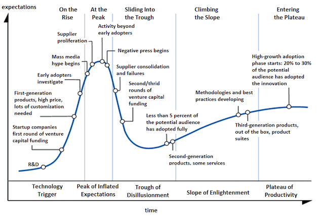 与之前提到的概念“technology life cycle adoption curve”相关的是另外一个概念“Hype Cycle”: