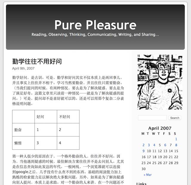 2005 年年底我开始写博客,学着搭了个 Wordpress,虽然已经出过两本书,但事实上,现在回头看,“写好文章”这事儿,当时我差得还远着呢…… 翻看那时的文章,功力肤浅。