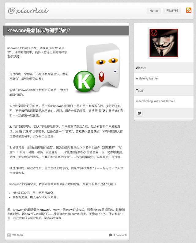 我真的去混 rubychina 社区,真的学,也真的学会了…… 真的认识了一票人,真的开始做东西了,最终,2013 年 1 月 19 日,我却没真的做在线教育,而是跟李路、沙昕哲搞了个 knewone.com …… 别说,还真挺火!